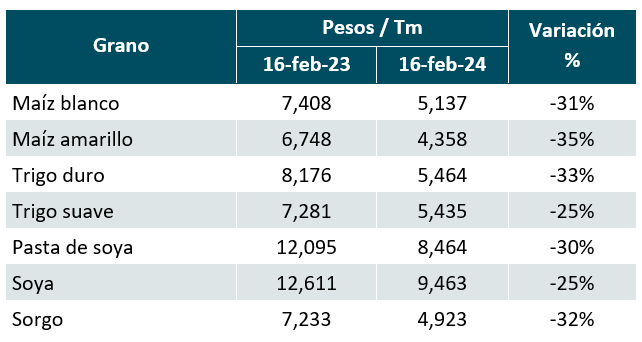 El 16 de febrero, los futuros de maíz tocaron nuevos bajos, tras las primeras previsiones del USDA del próximo ciclo en EUA, presentadas en su foro anual, que incluyen inventarios superiores a los del 2023/24. Los datos prevén una ligera caída en el área sembrada de maíz, pero con mejores rendimientos, estimado en 11.36 toneladas por hectárea, llevando así la disponibilidad total (la suma de inventarios iniciales, importaciones y producción) para el nuevo ciclo a 437.84 millones de toneladas. Esta cifra supera el récord previo del ciclo 2016/17 por más de 7.5 millones de toneladas.