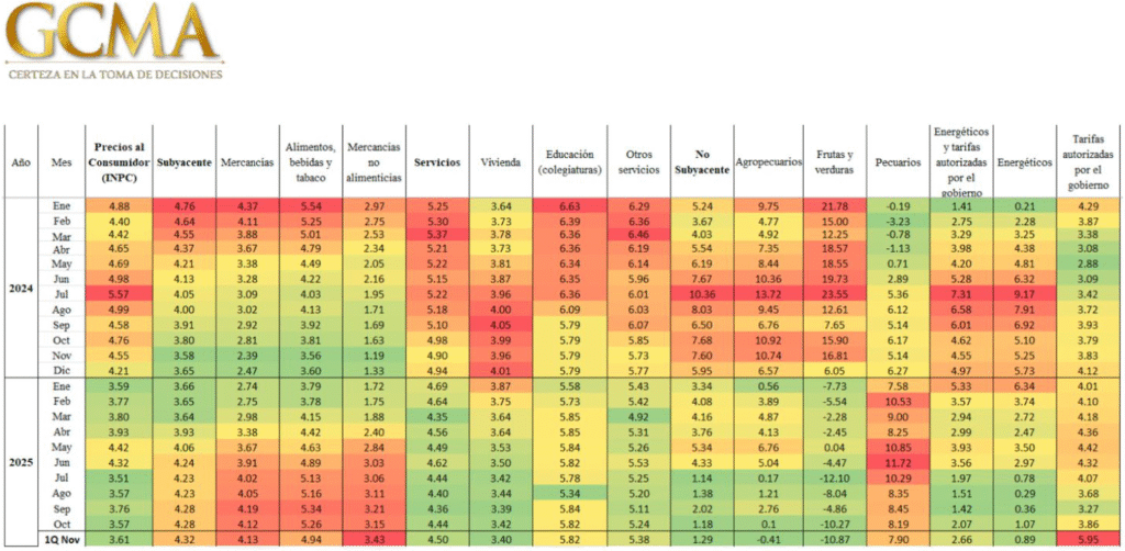 Componente subyacente: Presentó un repunte a una tasa anual de 4.32%, contra el 4.28% registrado en el mes anterior, reflejándose principalmente en mercancías no alimenticias (de 3.15% a 3.43%) y servicios (de 4.44% a 4.50%). Este dinamismo estuvo impulsado por la aceleración del Indicador Oportuno del Consumo Privado (IOCP), que pasó de 1.3% en septiembre a 2.2% en octubre 2025.