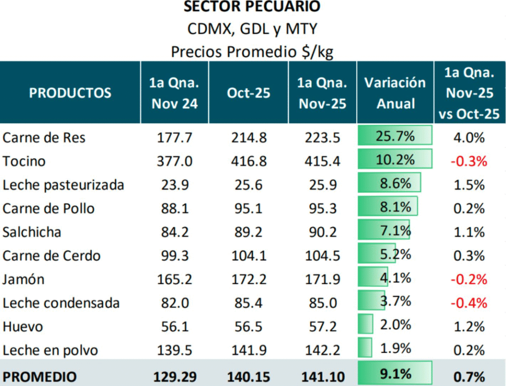 • Sector No Subyacente: Cabe destacar que tras 9 meses consecutivos en los que el sector pecuario presentó una tendencia al alza (5.14% desde nov. 24 hasta 10.29% en julio), los meses posteriores han presentado una tendencia a la baja hasta alcanzar 7.90% en la primera quincena de noviembre.