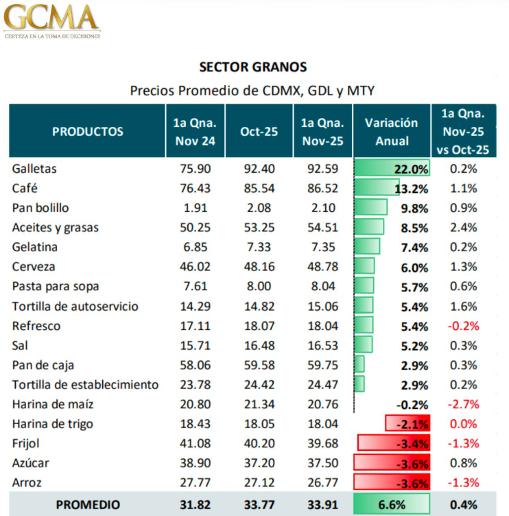 • No obstante, tras 9 meses, finalmente revierte su tendencia alcista al registrar 5.26% al cierre de octubre y caer hasta 4.94% en esta quincena, impulsado por la moderación en precios de insumos importados (trigo, maíz) y menores cotizaciones internacionales.