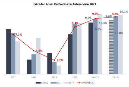 - El precio promedio de la canasta básica en CDMX crece de 9.0% a 9.4%, Guadalajara aumenta de 9.5 % a 10.0% . Mientras que Monterrey baja de 10.3% a 10.1%.