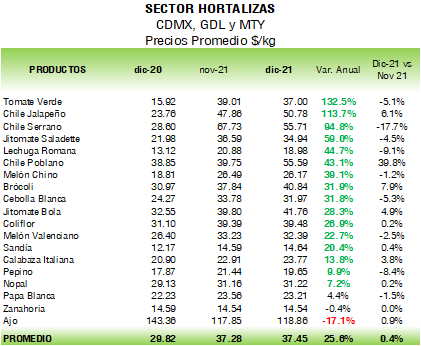 El índice de precios anual hortícolas refleja un crecimiento anual del 25.6%