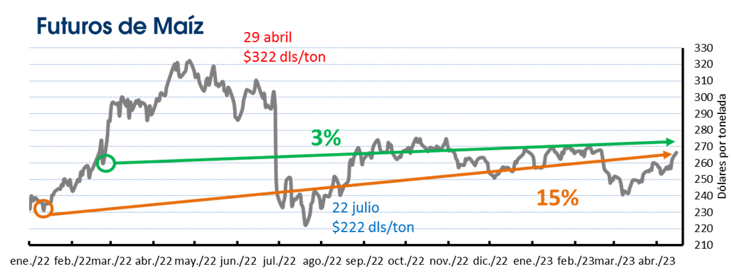 Los precios del cereal están 7 dólares por arriba de lo reportado desde que se concretó la invasión de Rusia hace un año, un alza de 3%, para situarse en 266 dólares por tonelada. Desde la segunda semana de enero del año pasado, los precios del maíz han aumentado 35 dólares, un 16%.