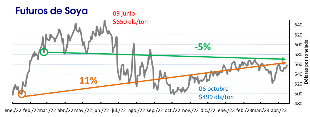 Al cumplirse un año de la invasión, los precios de la oleaginosa están 27 dólares por debajo del registrado el 24 de febrero del 2022, una baja de 5%, para situarse en 557 dólares por tonelada. Desde la segunda semana de enero del año pasado, los precios han aumentado más de 57 dólares, un 11%.