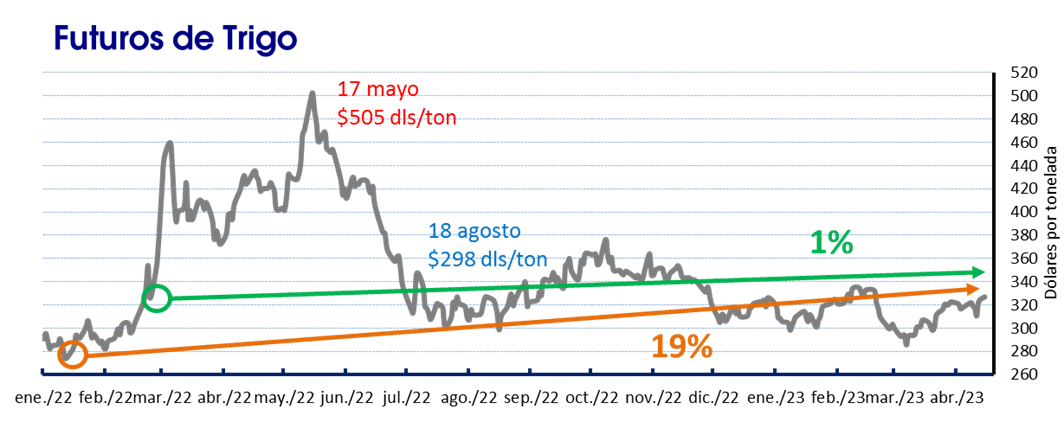 Los futuros del trigo duro están 1 dólar por tonelada por arriba del nivel registrado cuando se detonó el conflicto hace un año, 1% más, para ubicarse en 327 dólares. Desde la segunda semana de enero del 2022, los precios del trigo HRW han aumentado 53 dólares, un 19%.