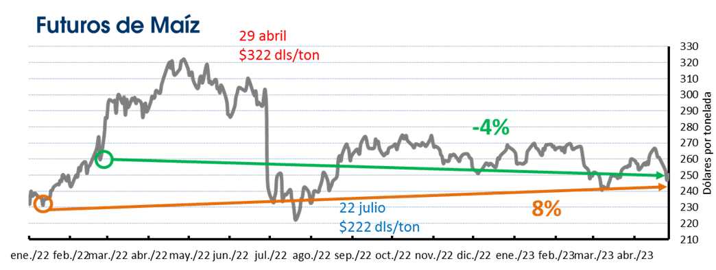 Los precios del cereal están 9 dólares por debajo de lo reportado desde que se concretó la invasión de Rusia hace un año, una baja de 4%, para situarse en 250 dólares por tonelada. Desde la segunda semana de enero del año pasado, los precios del maíz han aumentado 19 dólares, un 8%.