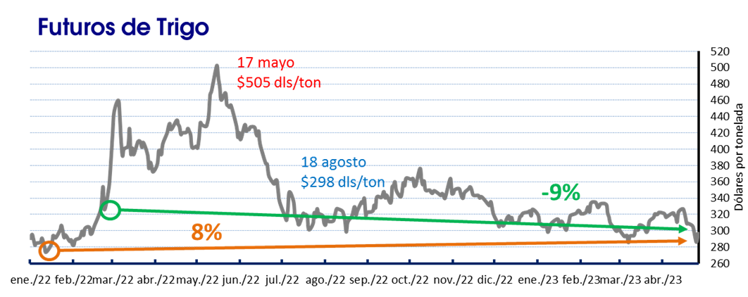 Los futuros del trigo duro están 29 dólares por tonelada por debajo del nivel registrado cuando se detonó el conflicto hace un año, 9% menos, para ubicarse en 297 dólares. Desde la segunda semana de enero del 2022, los precios del trigo HRW han aumentado 23 dólares, un 8%.