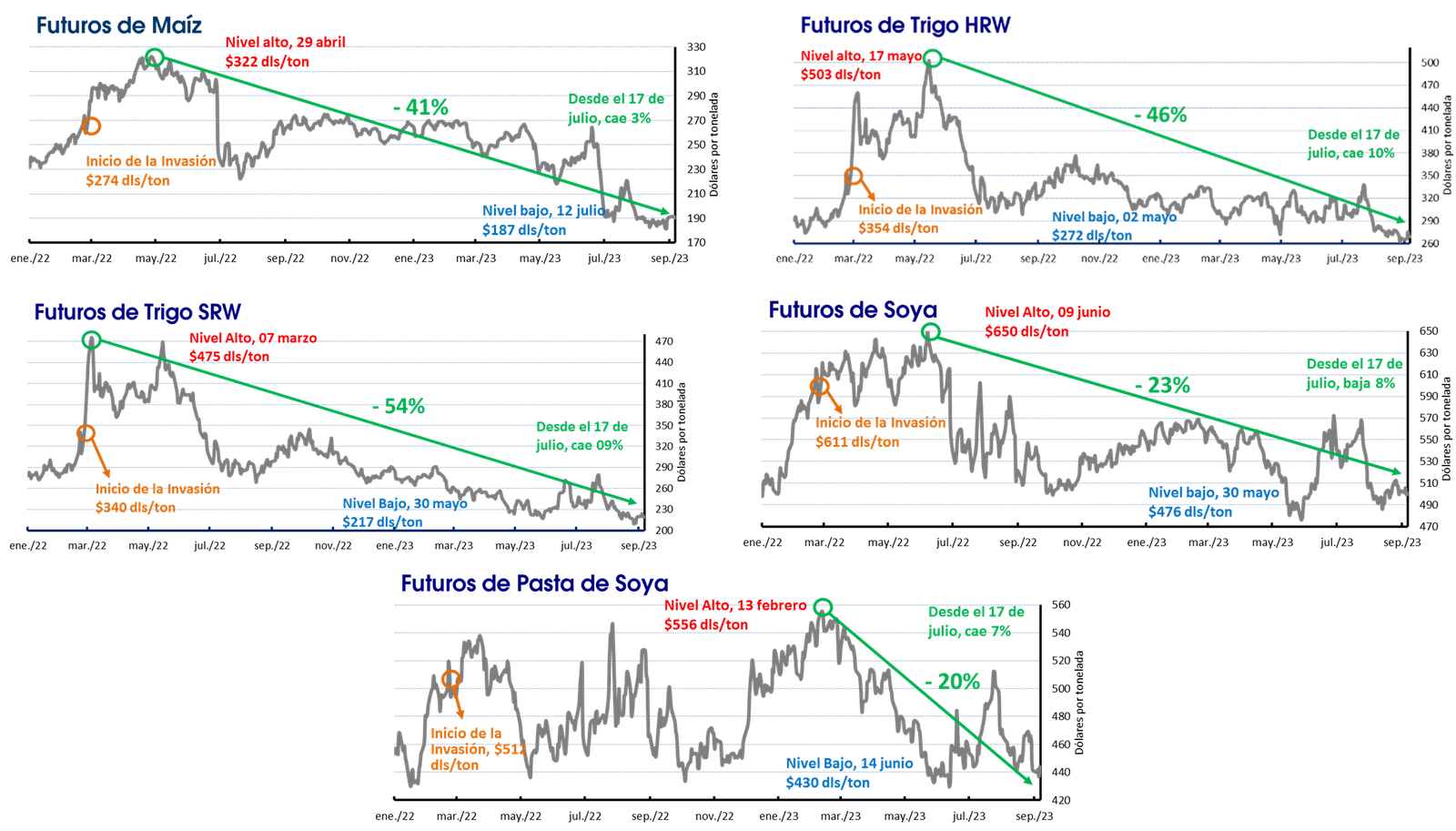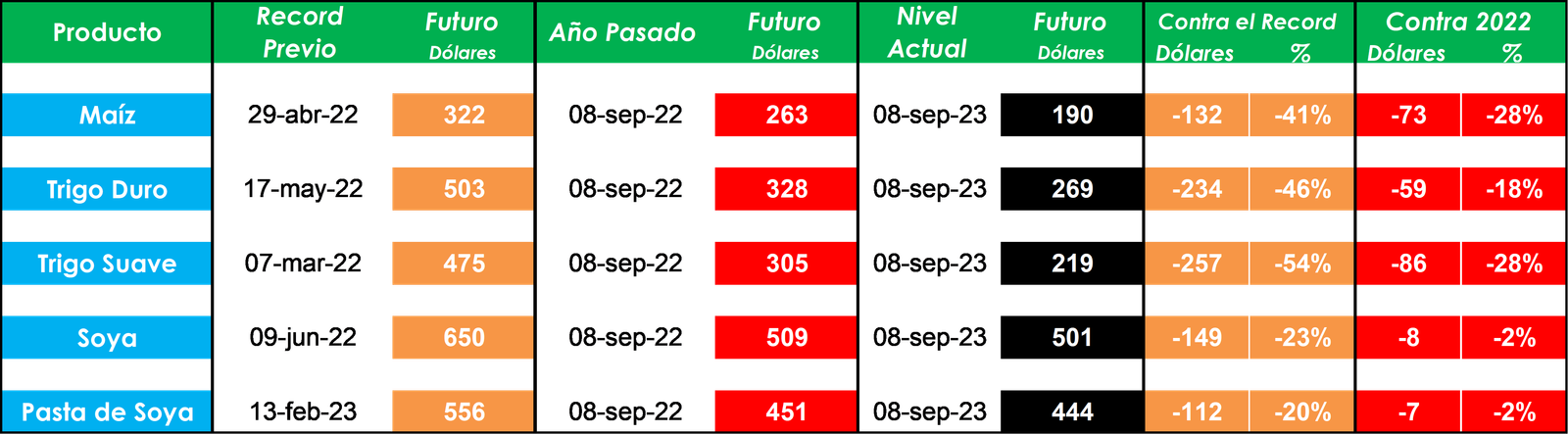 - La soya es presionada, en buena medida, por la sostenida competencia de las exportaciones de Brasil, que para el mes de septiembre se proyectan con un crecimiento superior al 100% en la comparación con el 2022, al sumar 7.32 millones de toneladas, según la Asociación Nacional de Exportadores de Cereales.