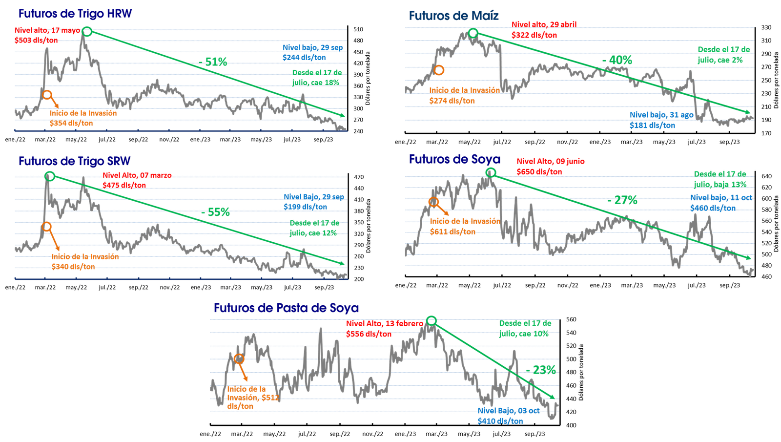 - Para el progreso de la cosecha de maíz, el mercado prevé un avance del 44% del área apta, contra el 34% mostrado el martes pasado por el USDA. En su actualización semanal de estimaciones, la ANEC proyectó las exportaciones de maíz brasileño durante octubre en un rango de 8.50 a 9.85 millones de toneladas, frente a las 8.50/9.31 millones del reporte anterior, a las 9.34 millones de septiembre y a las 6.17 millones de octubre de 2022.