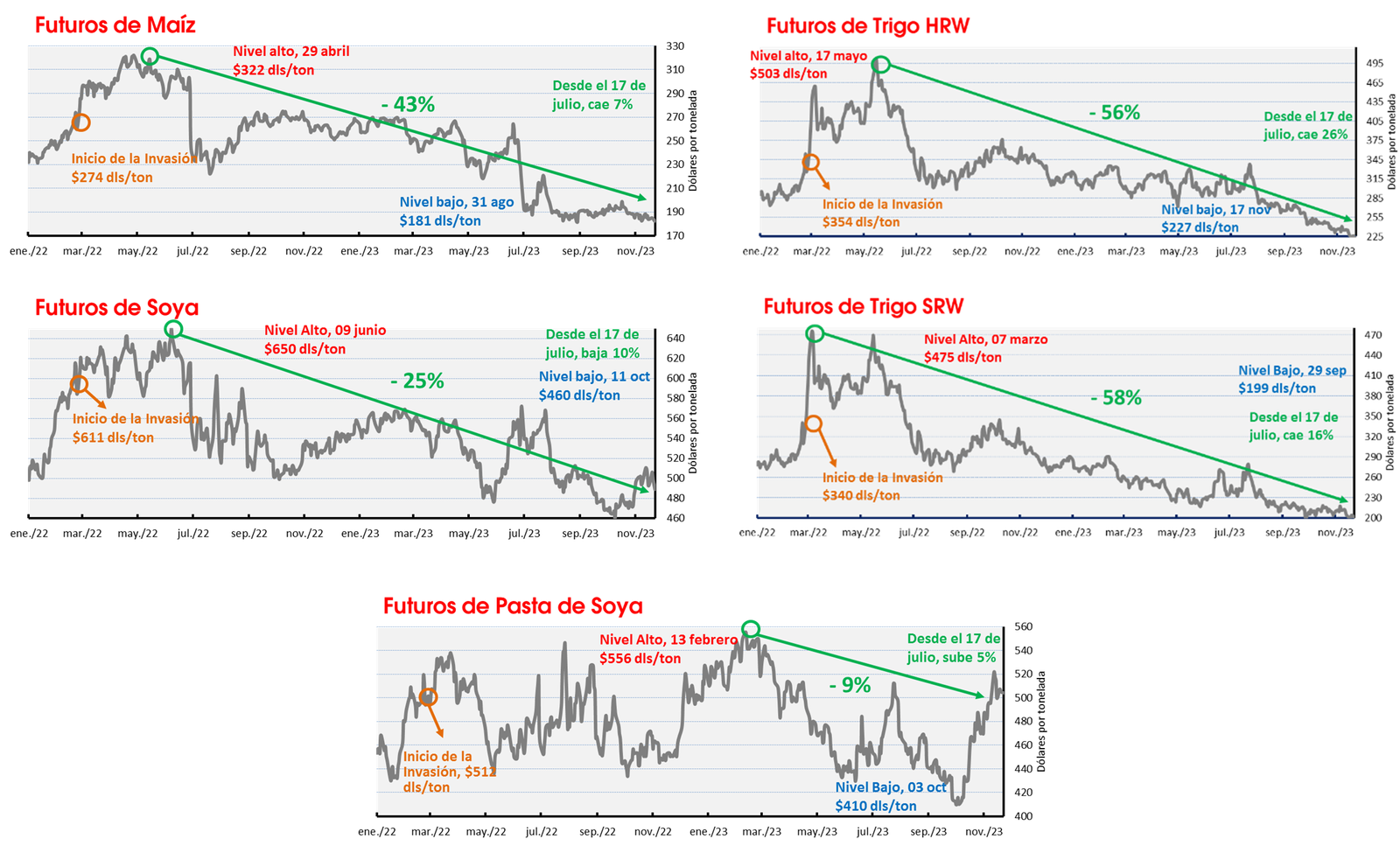 - La soya cerró la sesión y la semana con bajas. Dicho resultado adverso respondió, en parte, a ventas semanales que se ubicaron cerca del mínimo esperado. Existe la previsión de lluvias sobre zonas de Brasil que vienen padeciendo un prolongado estrés hídrico, en el centro y norte del país.
