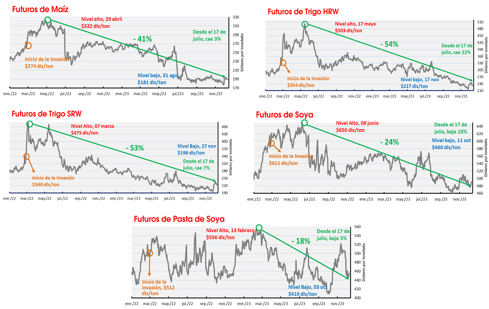 Los precios del maíz y el trigo continúan en la racha bajista que inicio con el reporte de oferta y demanda, mientras que el complejo de soya muestra una recuperación importante luego de varias semanas a la baja.