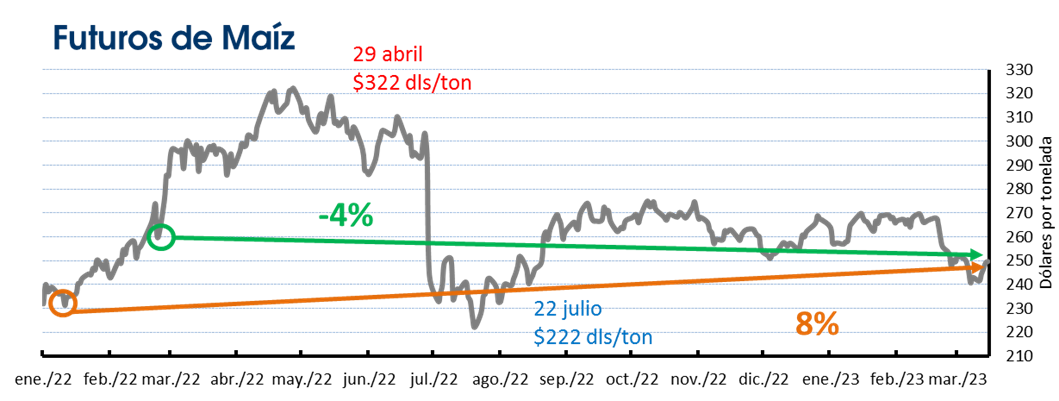 Los precios del cereal están 10 dólares por debajo de lo reportado desde que se concretó la invasión de Rusia hace un año, una baja de 4%, para situarse en 250 dólares por tonelada. Desde la segunda semana de enero del año pasado, los precios del maíz han aumentado 18 dólares, un 8%.