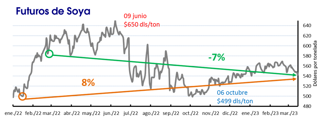 Al cumplirse un año de la invasión, los precios de la oleaginosa están 42 dólares por debajo del registrado el 24 de febrero del 2022, una baja de 7%, para situarse en 543 dólares por tonelada. Desde la segunda semana de enero del 2022, los precios han aumentado más de 42 dólares, un 8%.