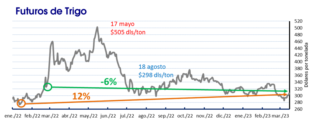 Los futuros del trigo duro están 19 dólares por tonelada por debajo del nivel registrado cuando se detonó el conflicto hace exactamente un año, 6% menos, para ubicarse en 307 dólares. Desde la segunda semana de enero del 2022, los precios del trigo HRW han aumentado 33 dólares, un 12%.
