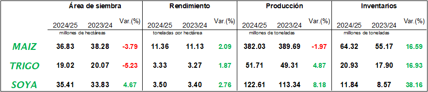 - El mercado espera una producción de soya récord para el 2025, de 122.61 millones de toneladas, un incremente del 8% comparado al año previo, cuando se cosecharon 113.34 millones. El stock final para el próximo ciclo se ubicaría en 11.84 millones de toneladas, un 38% por arriba de las 8.57 millones del 2023/24.