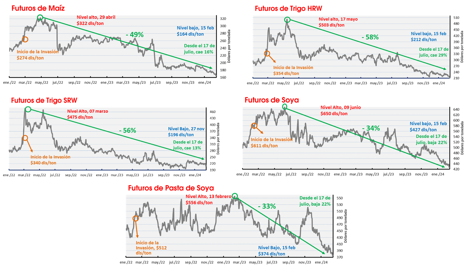 Los futuros de los granos alcanzan nuevos bajos tras las primeras previsiones del USDA del próximo ciclo en EUA, presentadas en su foro anual, que incluyen inventarios de maíz, trigo y soya superiores a las del 2023/24.