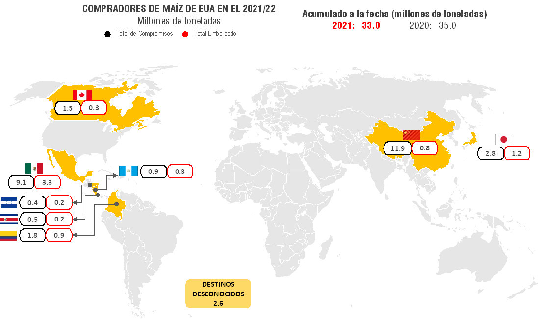 • MAIZ.- En su reporte semanal de las exportaciones estadounidenses, el USDA mostró ventas de maíz por 904,600 toneladas, por debajo de las 1.067 millones de toneladas de la semana anterior y cerca del mínimo previsto por el mercado, de entre 800,000 y 1.4 millones. China estuvo una vez más ausente del mercado de maíz. Aunque China tiene compromisos casi iguales a los de hace un año, ha embarcado solo 7% de sus compromisos este año, contra el 24% del año pasado.