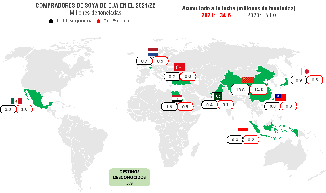 • SOYA.- El USDA mostró ventas de soya por 1.382 millones de toneladas, por encima de las 1.289 millones del reporte anterior y dentro del rango previsto por analistas, de entre 1 y 1.6 millones de toneladas. Del total de las ventas de EUA, 727,500 toneladas correspondieron a compras de China. Los compromisos de venta de soya estadounidense a China están casi 10 millones de toneladas por debajo del año pasado y constituyen la mayor parte de las 16.5 millones del retraso para todos los destinos.