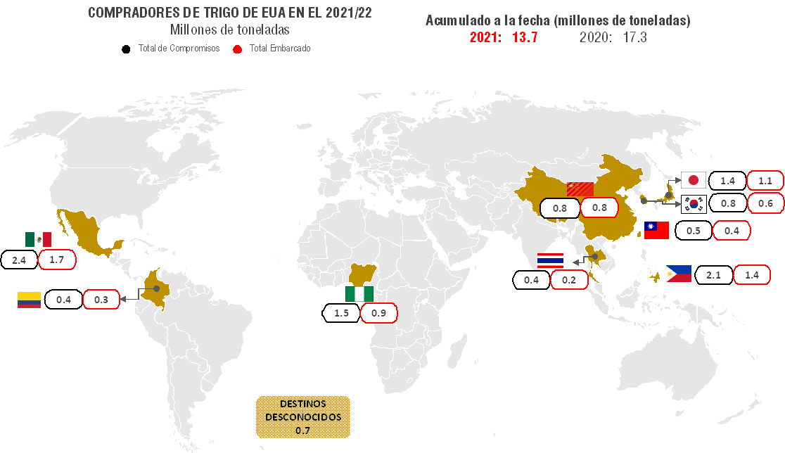 • TRIGO.- El USDA reportó las ventas semanales de exportación en 399,100 toneladas, por encima de las 285,900 toneladas de la semana pasada y dentro de las expectativas del mercado, de entre 250,000 y 500,000 toneladas. Las exportaciones de trigo de Estados Unidos siguen 3.6 millones de toneladas por debajo del año pasado, principalmente por los compromisos de Brasil y Asia.