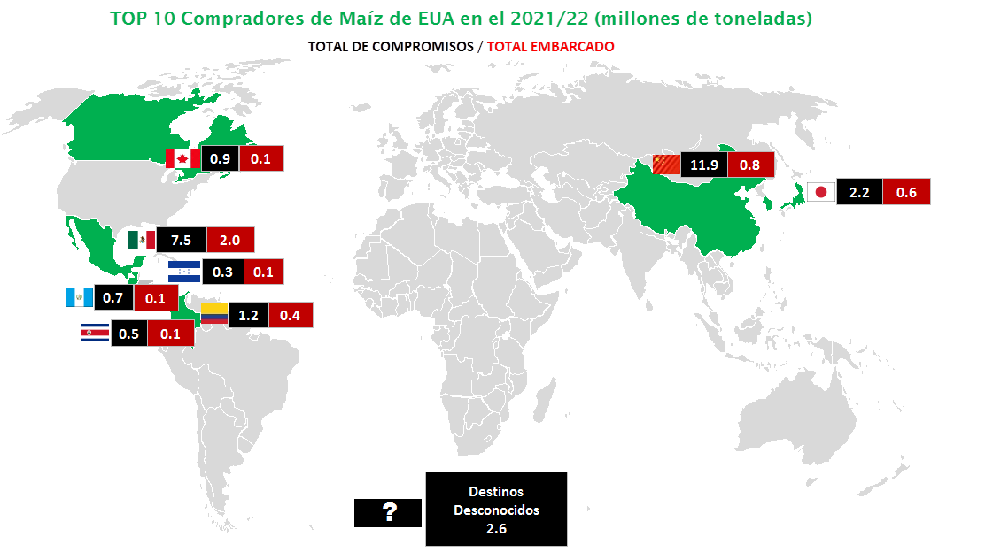 - En su informe semanal, el USDA mostró ventas de maíz por 1.273 millones de toneladas, por encima de las 1.039 millones del reporte anterior y dentro del rango calculado por el mercado, de entre 700,000 y 1.4 millones de toneladas. La prima del acumulado de los compromisos de venta del grano estadounidense contra el año pasado se ha reducido a 500,000 toneladas.