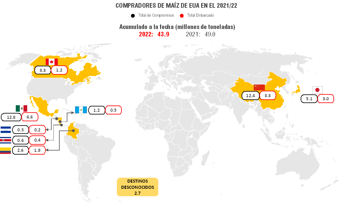 MAIZ.- El USDA reveló ventas de maíz del 2021/22 por 1.402 millones de toneladas, por encima de las 1.091 millones del informe anterior y de las expectativas del mercado, de entre 600,000 y 1.2 millones. Además, el organismo reportó ventas para el 2022/23 por 165,000 toneladas. Japón y México fueron los principales compradores de maíz estadounidense en la última semana, con «destino desconocido» en tercer lugar.