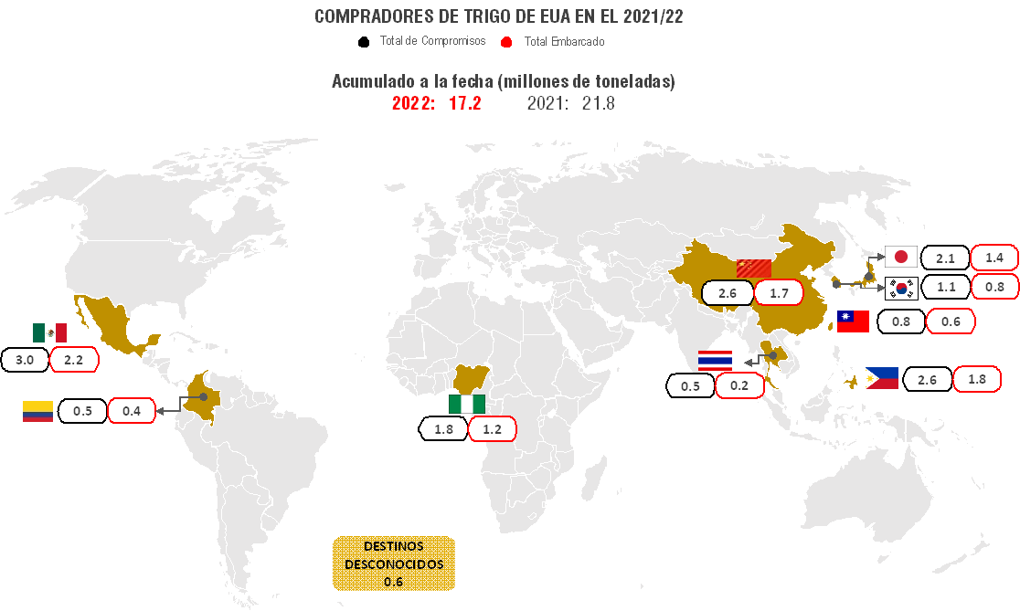 TRIGO.- En su informe semanal, el USDA reveló exportaciones de trigo para el 2021/22 en 676,700 toneladas, por encima de las 380,600 toneladas de la semana pasada y de las expectativas de los analistas, de entre 200,000 y 600,000 toneladas. Además, el organismo reportó ventas para el 2022/23 en 60,000 toneladas. Los principales compradores de trigo estadounidense en la última semana fueron Filipinas, Nigeria y Japón.