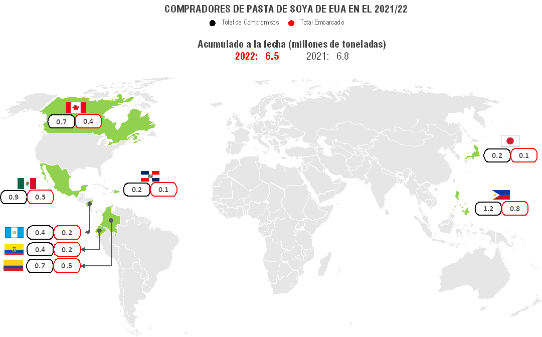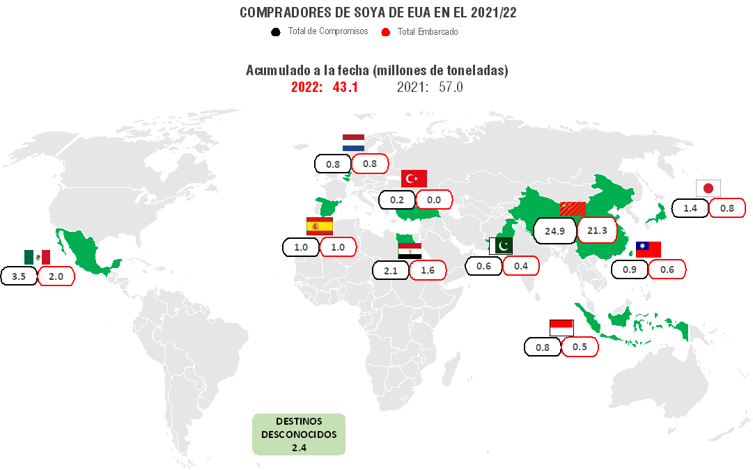 SOYA.- Las ventas de exportación se reportaron en solo 670,000 toneladas. China compró 797,000 toneladas, pero una gran cancelación de destinos desconocidos por un monto de 984,000 toneladas afectó el total. Los compromisos del año agrícola son ahora más lentos y ascienden a 14.2 millones de toneladas, de los cuales 9.5 millones pertenecen a China.